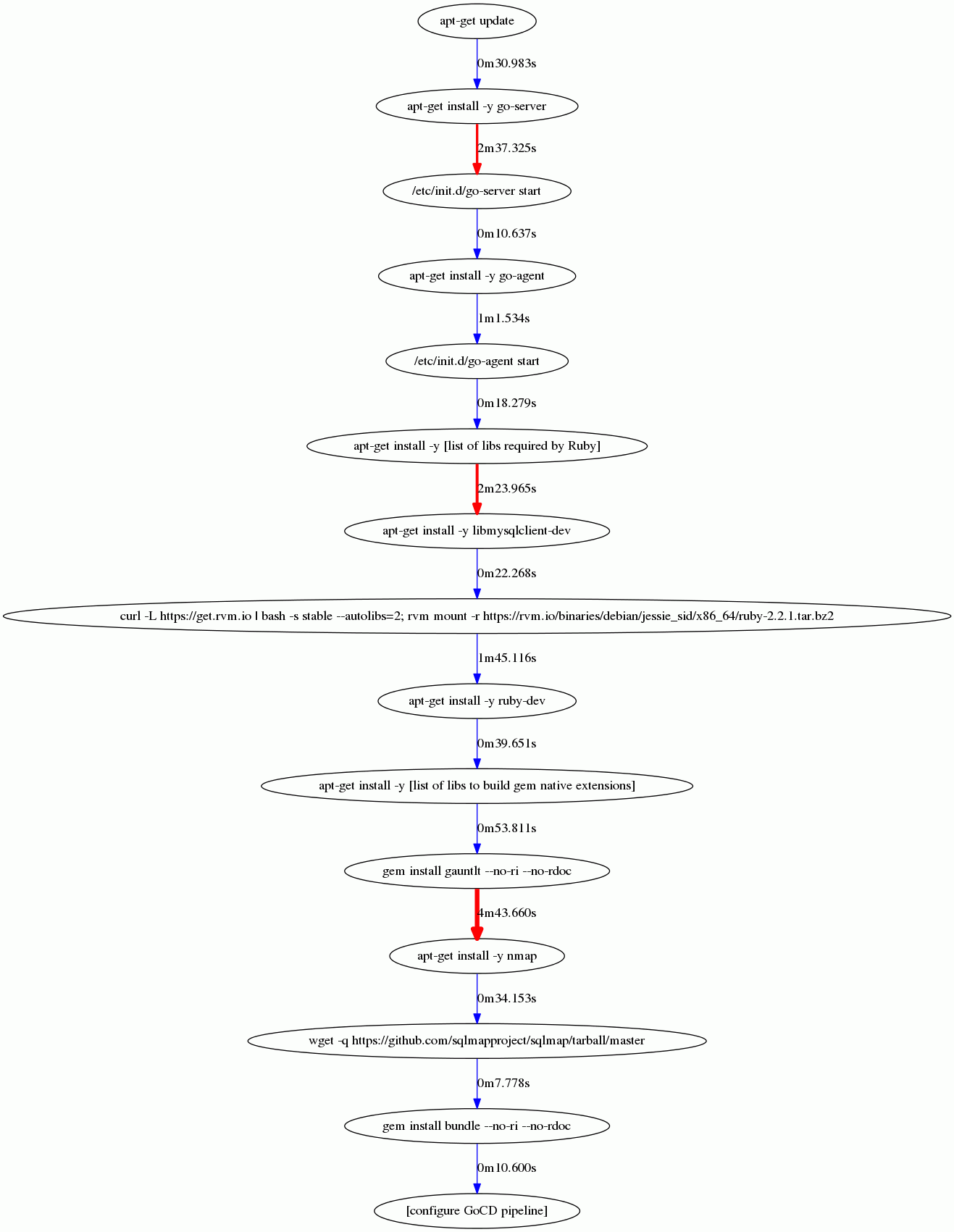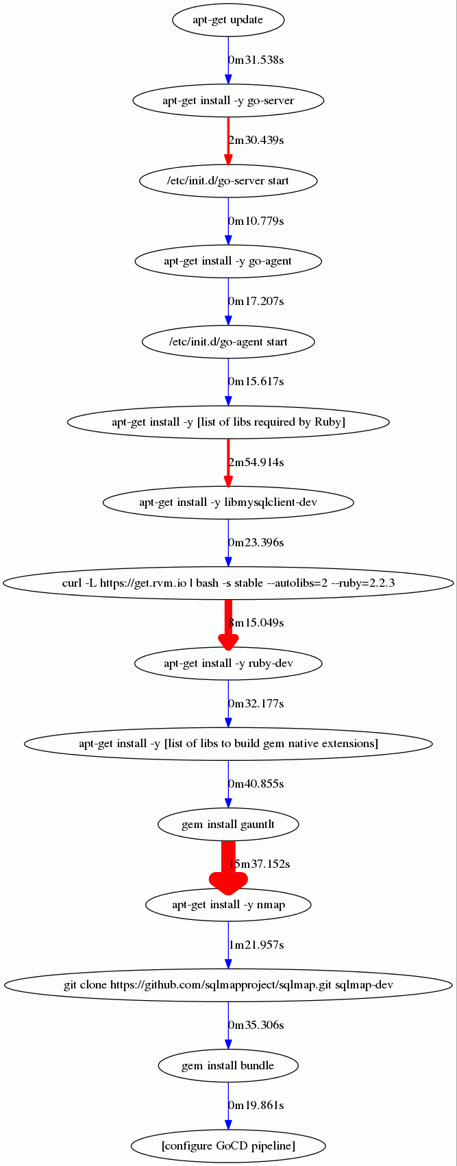 As you can see the time bottlenecks now (besides the gauntlet gem install which we’ve reduced significantly) are those which we did not/could not address, namely GoCD server’s installation and the install of required libs for Ruby.
