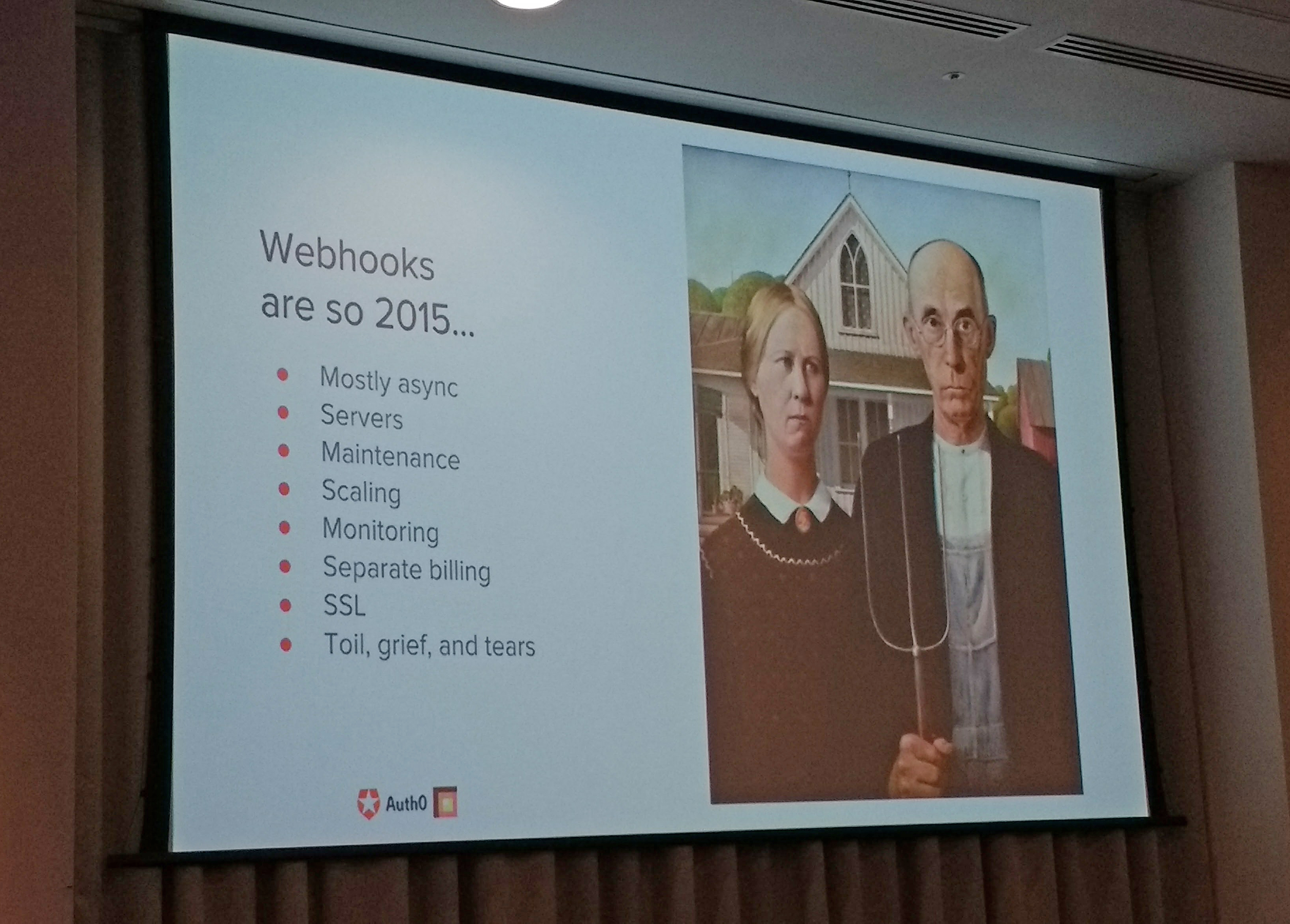 The essence of Webtasks is that although Webhooks are amazingly useful they are invariably exposed, and as per the slide are described as ‘so’ 2015 (for the reasons listed):