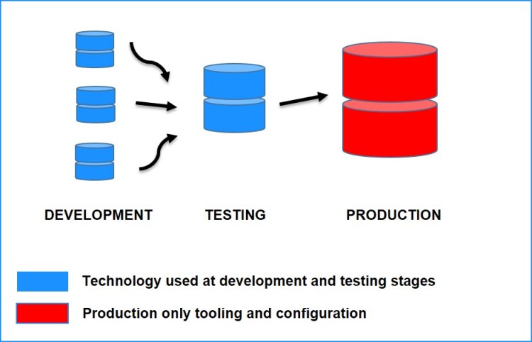 One organisation which I recently worked with moved to Oracle Exadata for its live transactional database. The improvement in query speeds was astonishing, and the built-in diagnostic tooling very useful. However, the Exadata machines were for Production and Pre-Production only (due to cost) and, because Exadata worked so differently from the versions of Oracle in upstream environments, it was difficult to predict the query behaviour before deployment to Pre-Prod, leading to uncertainty about performance. Furthermore, the ‘developer’ version of the database, Oracle XE, only allowed a single schema, significantly hampering useful automated testing in deployment pipelines. The presence of the high-speed Exadata machine also meant that requests from developers and testers to improve the database to enable better development and testing tended to be ignored because “Exadata will handle it fine in Production”, leading to ever-slower integration tests and development speed!