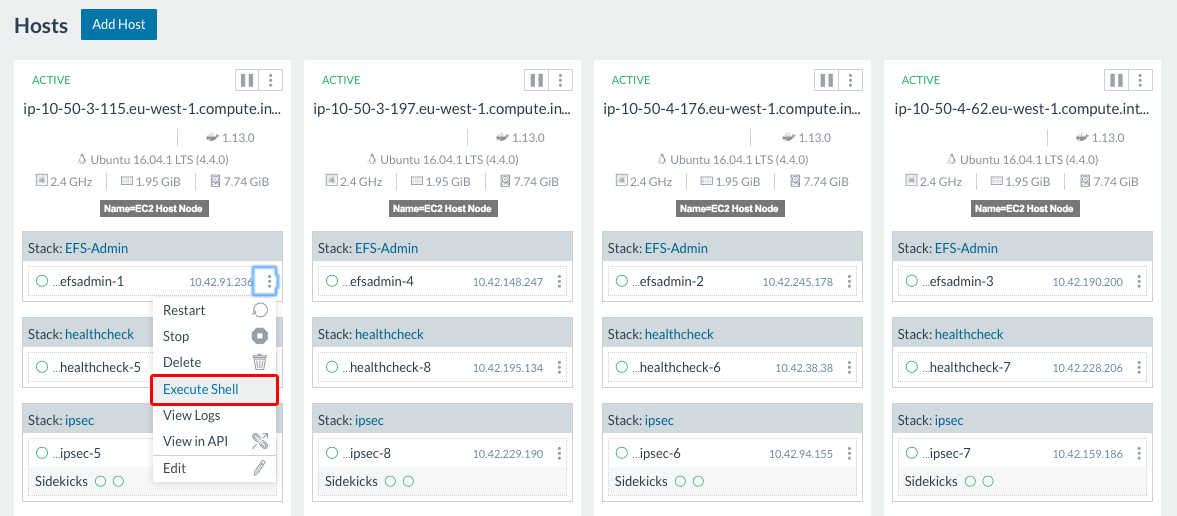 From within the Rancher hosts console, select a host and execute a shell from the stack you have configured to use Rancher-EFS. With our example the stack is EFS-Admin (Fig:19).