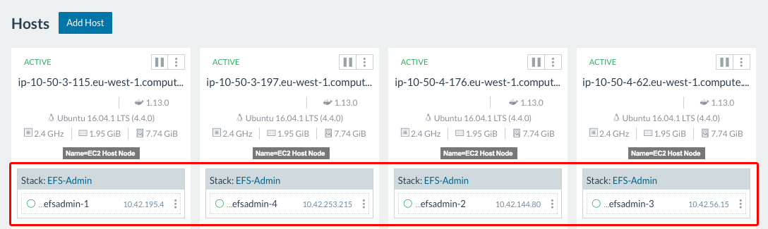 The EFS storage volume is now mounted via NFS to the EFS Admin Service on each of the EC2 Host Nodes (Fig:18)