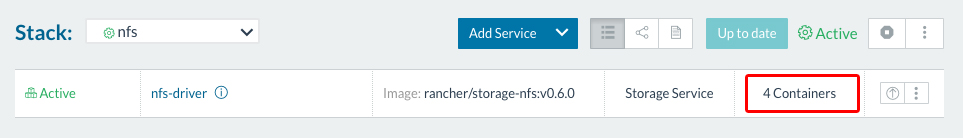 Once the stack is launched its active state can be viewed, upgraded, and other services added. The stack state example for our Rancher-NFS service (Fig:9) shows x4 containers as there are x4 hosts running and the stack service is running on each host (Fig:10).