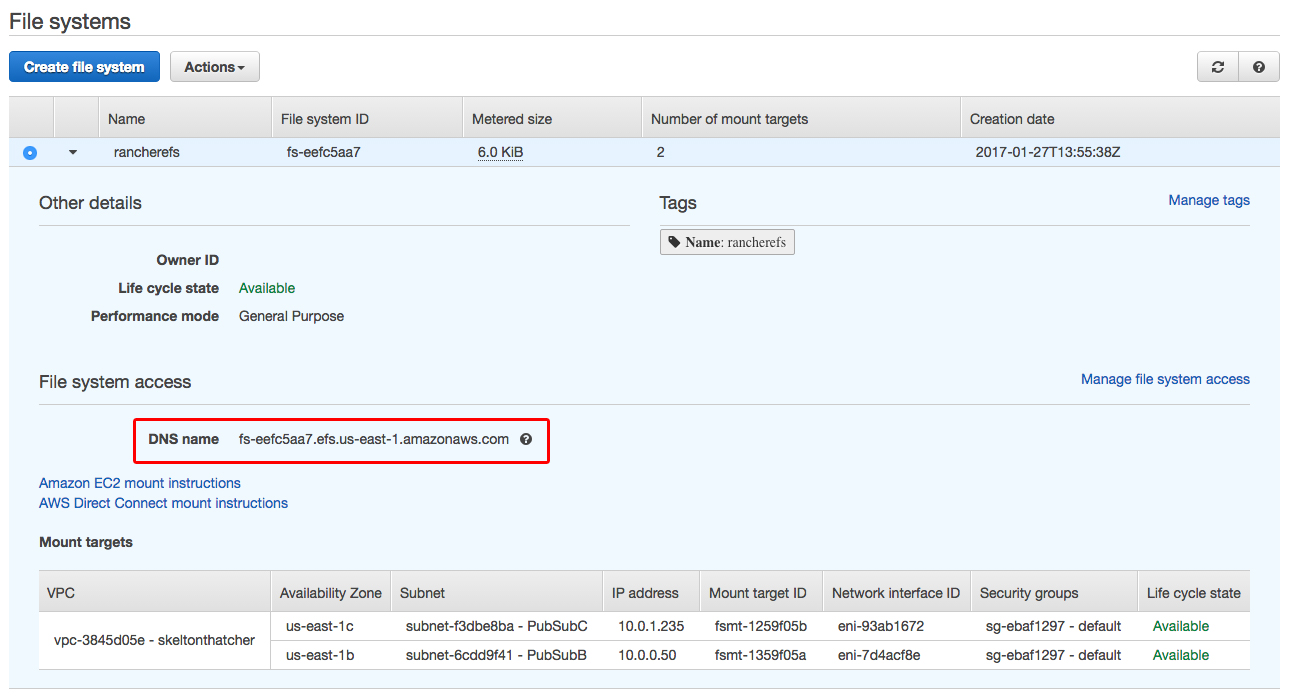 With the EFS volume created, make a note of the DNS name (Fig:6). Previously, EFS mount points were zone specific, the DNS name is a recent addition and now provides a single entry point for mounting multi-AZ file systems.